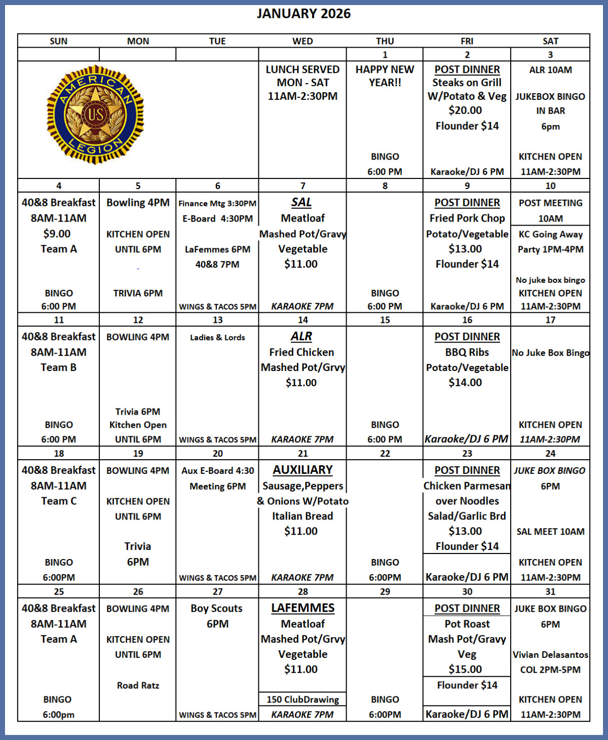 To DOWNLOAD a copy of the JANUARY 2026 POST 178 EVENT CALENDAR 'click the link' below DOWNLOAD CALENDAR
