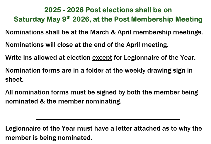 Nominations for Legion Officers are on the desk by the weekly sign in sheets.